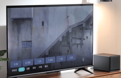 绿联云TV版具备清晰度调节功能,支持倍速播放,使用遥控器可直接进行选集操作,还能选择音轨、字幕以及解码方式。
