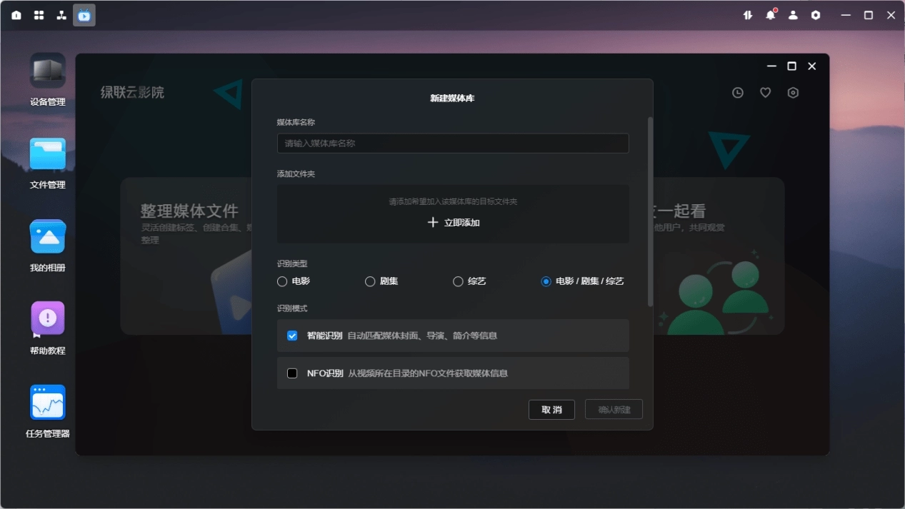 进入绿联云影院后,点击新建媒体库。