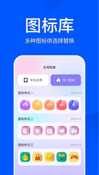 1. 拥有丰富的图标资源库,用户可挑选各类不同风格的图标,用来替换那些被隐藏的应用图标,从而让手机界面更具个性化特色。