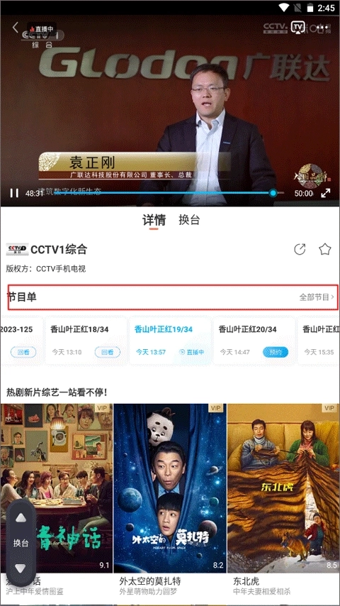 4、app就会自动切换至横屏模式,进入播放页面,你能够完成投屏、切换频道、查看节目单等操作。
