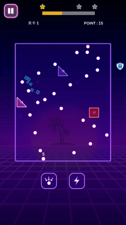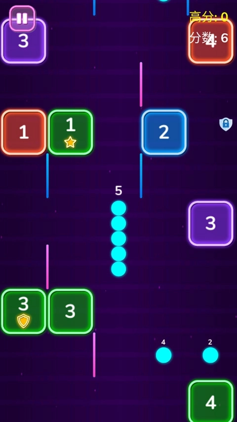 用地下的小球朝着墙或方块击打,当方块被击中的次数和所写次数一致时,方块就会消失,所有方块都消失后即为通关。