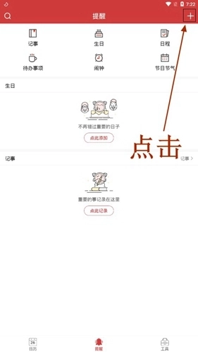 进入提醒功能分区后,点击上方的【+】号按钮,即可添加生日信息。