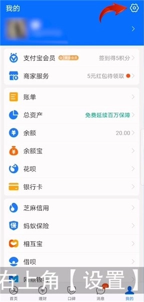 打开【支付宝】客户端,然后点击右下角【我的】,点击右上角【设置】图标,