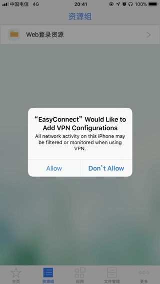 3、第一次登录VPN可能会弹出如下英文提示,选择“Allow”。随后会自动跳转至网络连接请求界面,点击“确定”完成验证。