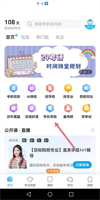 用户打开登录应用进入首页后,点击【学长学姐】板块。