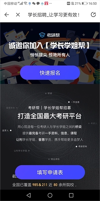 考研帮app是北京盈禾优仕科技有限责任公司最新推出的考研一站式移动学习平台,与官网数据实时同步。这款应用的用户基数庞大,数据显示每5个考研人中就有4个在使用它,超200万应往届考研人通过考研帮完成查信息、下载资料、结交研友、联系学长、背单词、做真题、听课程等多种需求。此外,应用界面设计简约,设有院校资讯、考研经验、考研资料、考研论坛等丰富栏目,还支持按学校、按地区分类展示,方便用户随时随地获取最新考研资料,助力高效备考。