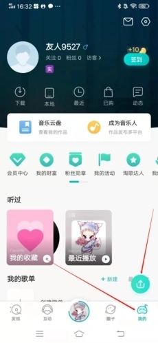 1、进入5sing音乐官方免费版后,首先点击右下角“我的”,在点击右下方“↑”按钮;