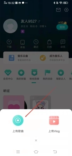 2、在弹出窗口中,点击“上传歌曲”,如果是视频,也可以点击“上传Vlog”;