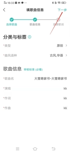 4、将该作品的各种相关信息全部填入,确认无误后,点击右上方“下一步”;