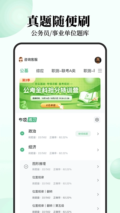 腰果公考可让不同考生根据自身学习状态与需求,通过拥有多种组卷方式的历年真题模拟进行精确可靠的模拟练习,结合专业的解析课轻松解决课题难点,还充分利用免费公开课直播,获取热门知识点精讲,高效突破弱项重点,想考公上岸更轻松的用户现在就来下载体验吧。