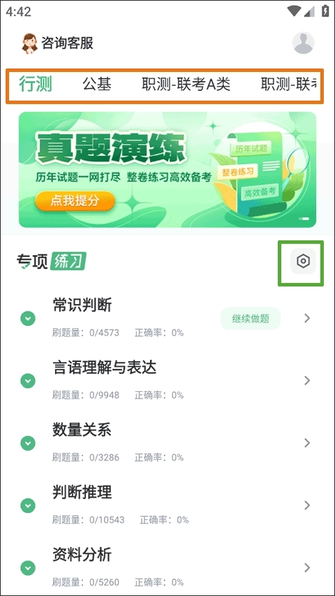 1、打开应用后,在初始界面找到红色方框标注的选项,点击它就能切换考试种类了。