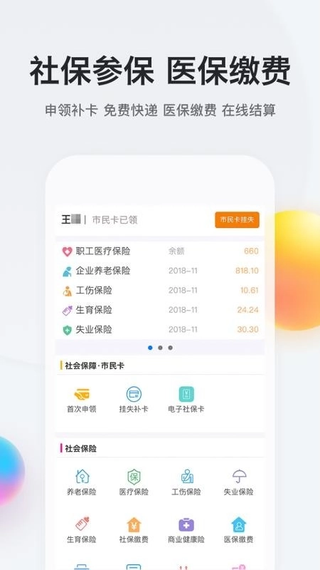 支持用户在线查看社保账户内养老、医疗、失业、工伤、生育等保险金额明细;