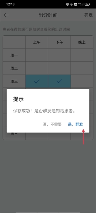 (3)这时页面弹出一个提示,是否群发通知给患者,点击“是,群发”。