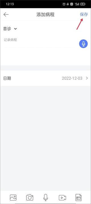 (3)然后添加病程,就是记录首诊期间的全部过程,填好后点击右上角“保存”。
