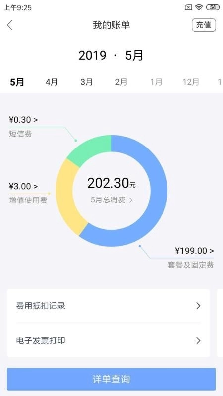 2、账单查询:提供当月实时话费查询以及套餐查询,以及最近六个月的历史账单;