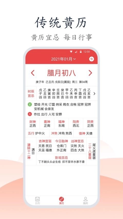 1、日历:黄历宜忌、节日节气、吉日查询、历史查询;