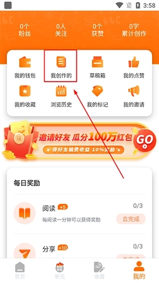 3、跳转至【我创作的】页面,点击【作文投稿】;