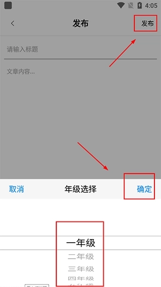 5、然后再选择自己所在【年级】,完成后,点击发布即可。
