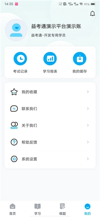 登录成功后,点击下方菜单栏里的【我的】就能进入个人中心页面,在这个页面可以查看用户个人信息、考试记录、学习报表、我的缓存以及系统设置等内容。