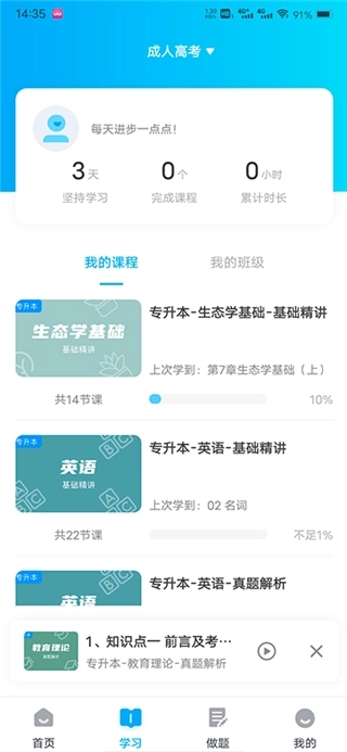 登录成功后,点击页面底部菜单栏里的【学习】板块,进入班级与课程界面,就能看到你当前正在学习的课程和班级了。
