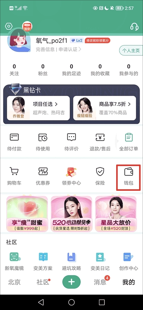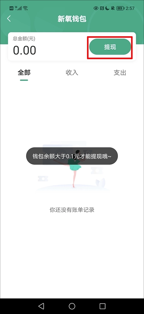 2、进入新氧钱包界面后,找到并点击右上方的“提现”选项,就能启动提现流程了。