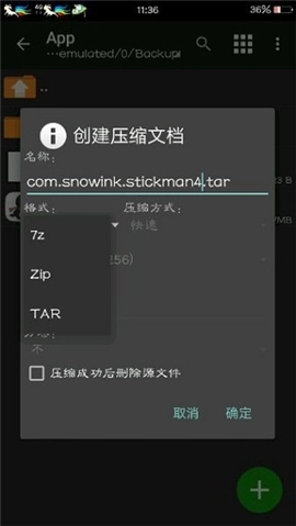 6、打开ZAchiver,先对原有的tar格式压缩包进行重命名操作,复制下它的名称后即可将其删除;接着长按修改后的data文件,选择“压缩…”选项,压缩格式保持为tar。