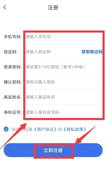 2、然后输入手机号、姓名、身份证号,以及设置密码,填写手机验证码后点击【立即注册】
