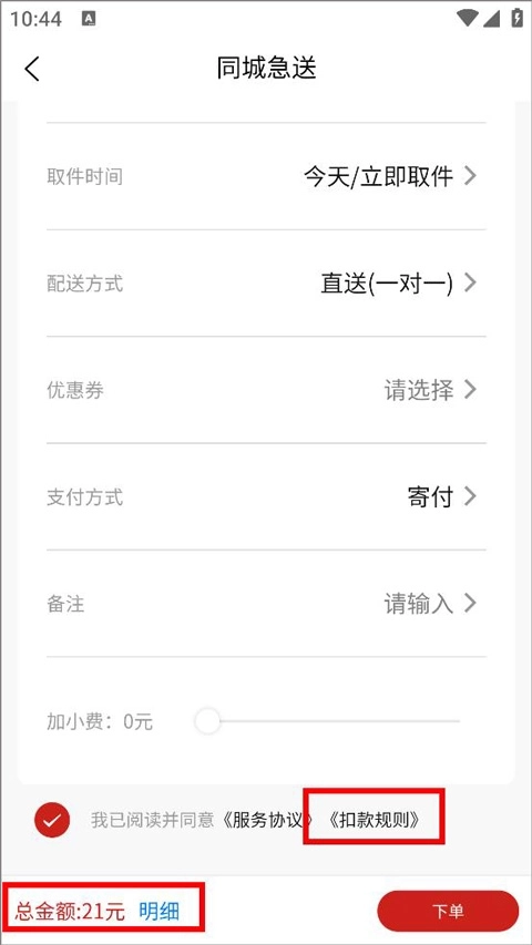 用户打开同城急送app后,进入常用服务板块,填写取件与收件的相关信息,随后在下单环节就能查看订单总金额以及具体的扣款规则。