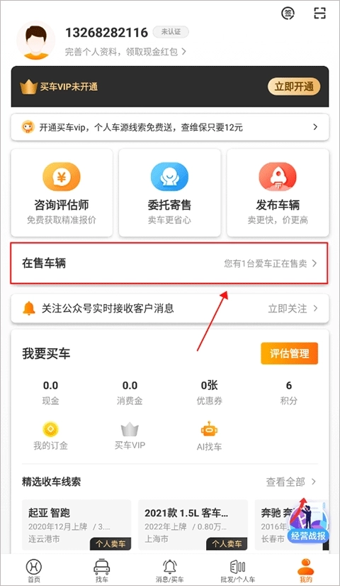 1、在我的界面中点击“在售车辆”选项