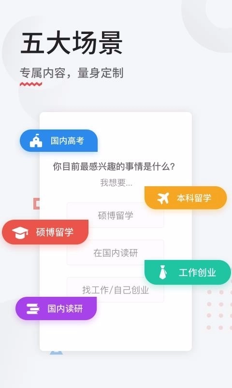 选择你最感兴趣的事情,硕博留学、在国内读研、找工作或者创业,为你量身定制专属内容