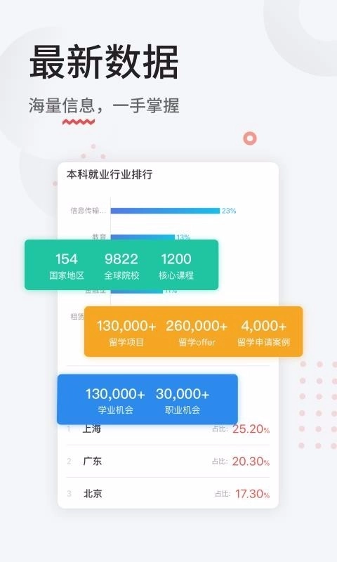 查看就业行业排行榜以及城市百分比,了解各种留学项目与申请案例
