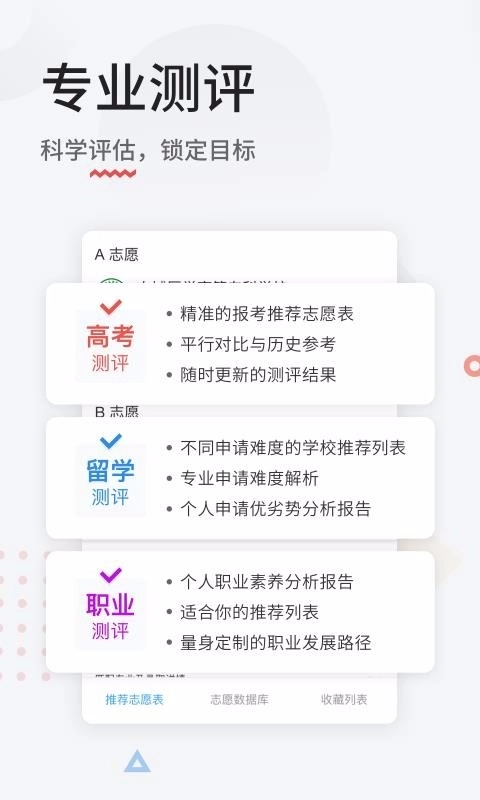 各类测评工具,如高考志愿推荐表、留学院校推荐清单、个人职业素养分析报告等,都能助力你做出更优决策。