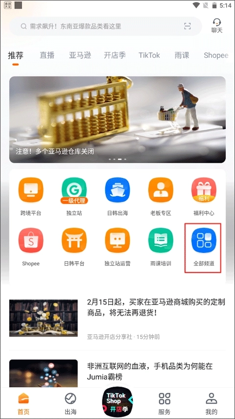 1、首页的功能包含了跨境平台、独立战、日韩出海、老板专区等,进入【首页->全部频道】;