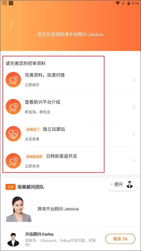 4、你可以向雨果网跨境电商平台的顾问询问开店相关的问题,然后完善自己的初审资料才能有资格开店。