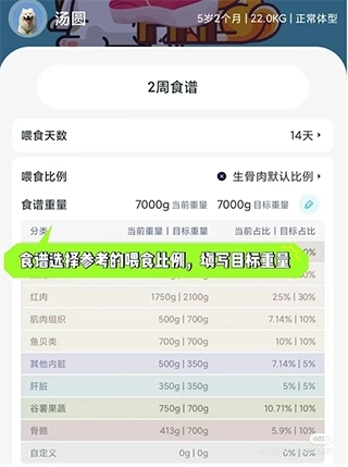 先填写食谱标题,接着选择食谱计划的喂食天数和参照的喂食比例,再填写食谱的重量,之后就能看到每个分类食材的目标重量克数以及当前的分配情况了。
