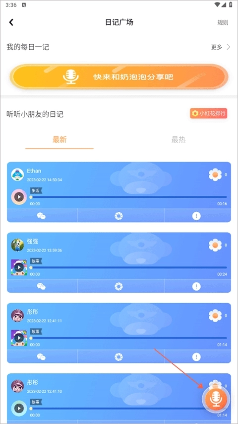 2、进到日记广场界面点击右下角的“话筒”图标。