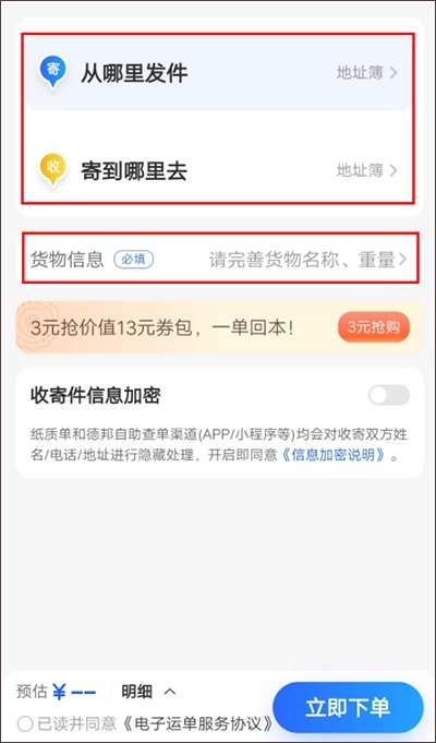 3、在【寄快递】页面,输入寄件地址与收件地址,及货物信息。输入完成后,选择寄件方式:标准快递、特快专递。然后再选择快递员上门时间,以上内容填写完成点击【立即下单】即可完成快递下单,之后耐心等待快递员联系你来取件即可。