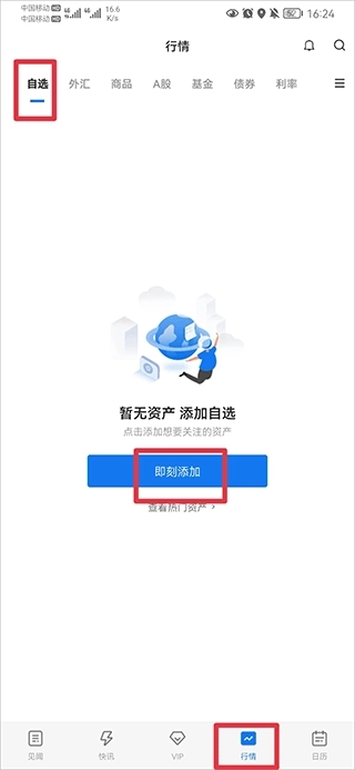 1、打开华尔街见闻app,进入行情界面后找到自选功能,点击“即刻添加”按钮。