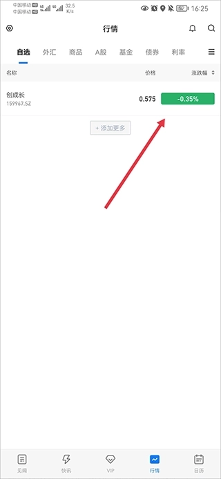 4、然后返回到行情界面后就可以实时查看该股票的涨跌幅情况了
