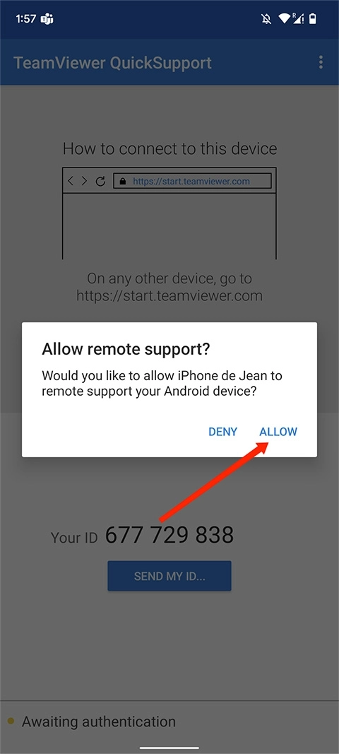 2、在被控制端的手机上会弹出一个远程控制确认,选择“ALLOW/允许”选项,