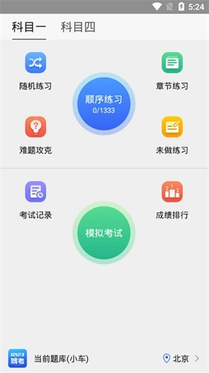2、看到主页面你可以有两大选项:考试和练习,先选择练习看一下;