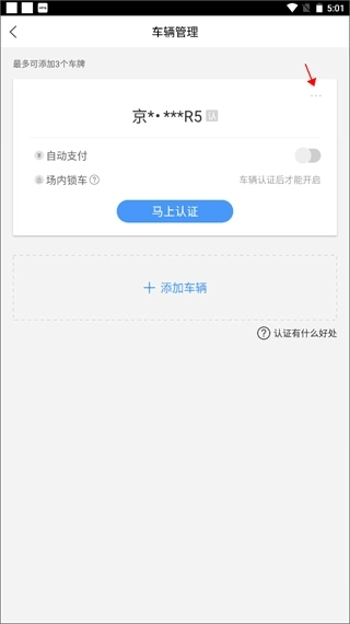 1、同样还是在【我的】界面,点击“车辆管理”选项。2、这时点击红色箭头指向的三点图标。