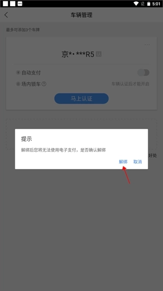 3、页面出现了“解绑车牌”这几个字,点击它。