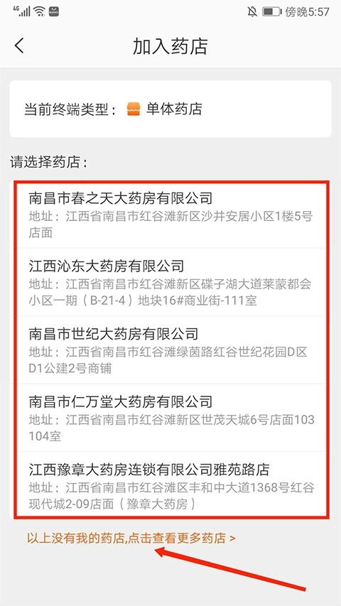 3、可在列表中出现附近的药店名称进行查找或者选择下方“以上没有我的药店,点击查看更多药店”选项,