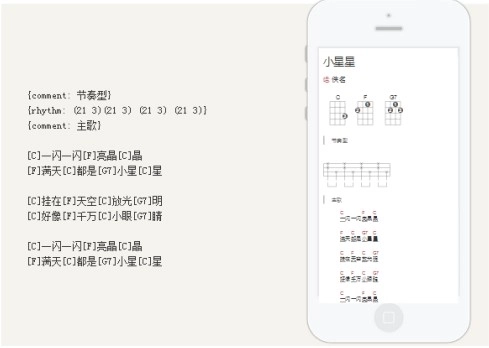 有谱么编辑器是专门针对吉他与尤克里里弹唱谱打造的曲谱编辑工具,其底层依托一套简洁易用的标记语言。 就像下面的例子所展示的,只需通过简单的纯文本内容,便可以生成右侧呈现的和弦曲谱。