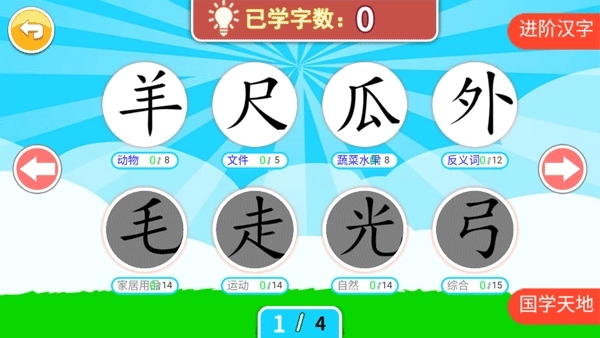 2、点进去识字模块,会分为三个小模块,一个是基础汉字学习,一个是进阶汉字,而另一个是国学天地。