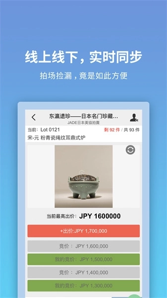 联拍在线app是一款专注于艺术品线上拍卖服务的应用,专为艺术品收藏爱好者打造。用户可在此参与感兴趣的拍卖活动,竞拍成功即可轻松获得心仪藏品,无论身份与地域,都能便捷参与艺术品线上拍卖;平台涵盖的拍卖艺术品品类丰富,能满足更多收藏爱好者的需求,用户看到喜爱的艺术品时,可查看其鉴定报告,专业鉴定团队提供服务,确保每件拍品均为真品;若用户自身有艺术品待拍,也能通过平台寻找本地专业拍卖公司合作,操作十分便捷,感兴趣的用户不妨下载联拍在线手机版体验使用。