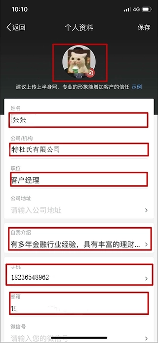 第四步:点击上面的头像框设置头像,这个头像将是个人名片的头像,随后输入下面各类信息,姓名、单位、职位、自我介绍、联系方式等信息,方便客户及时联系我们。