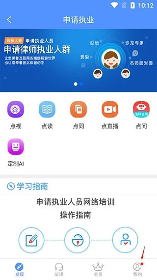 1、第一步先在手机上启动该软件,像下图展示的那样,随意点击申请执业、律师学院、基层法工这类选项;