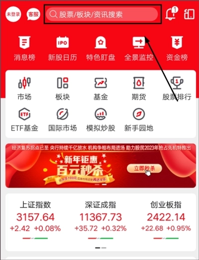 1、打开登录指南针股票app,在点击首页上方【搜索栏】查找;